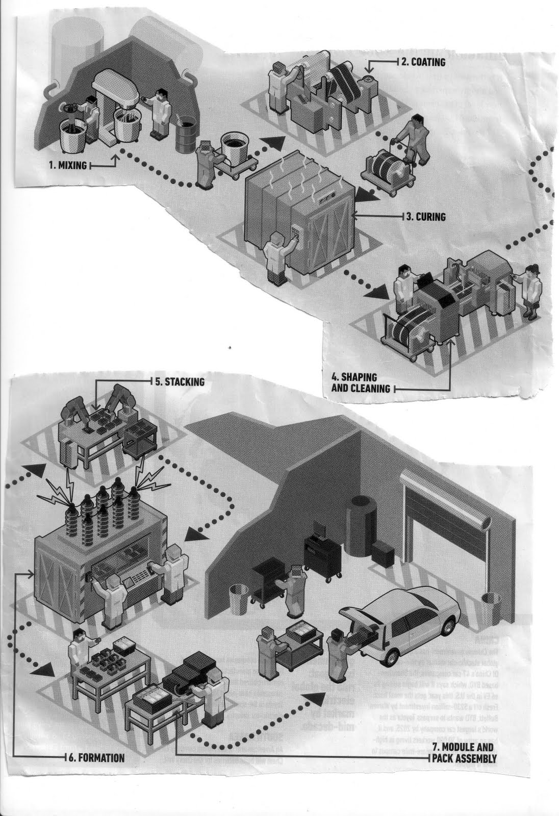 7- Làm môđul và ráp gói lại . Bó các tế bào với nhau ( song song với cơ chế làm nguội và hâm nóng mạch điều khiển điện thế - voltage monitoring circuitry, và những hệ thống kiểm soát khác ) làm ra những môđul. Bó các môđul với nhau trong một hộp và quấn thêm dây mạch điêu khiển hầu làm thành một gói bình điện hoàn tất , nghĩa là một hộp cung cấp điện cho xe chạy .